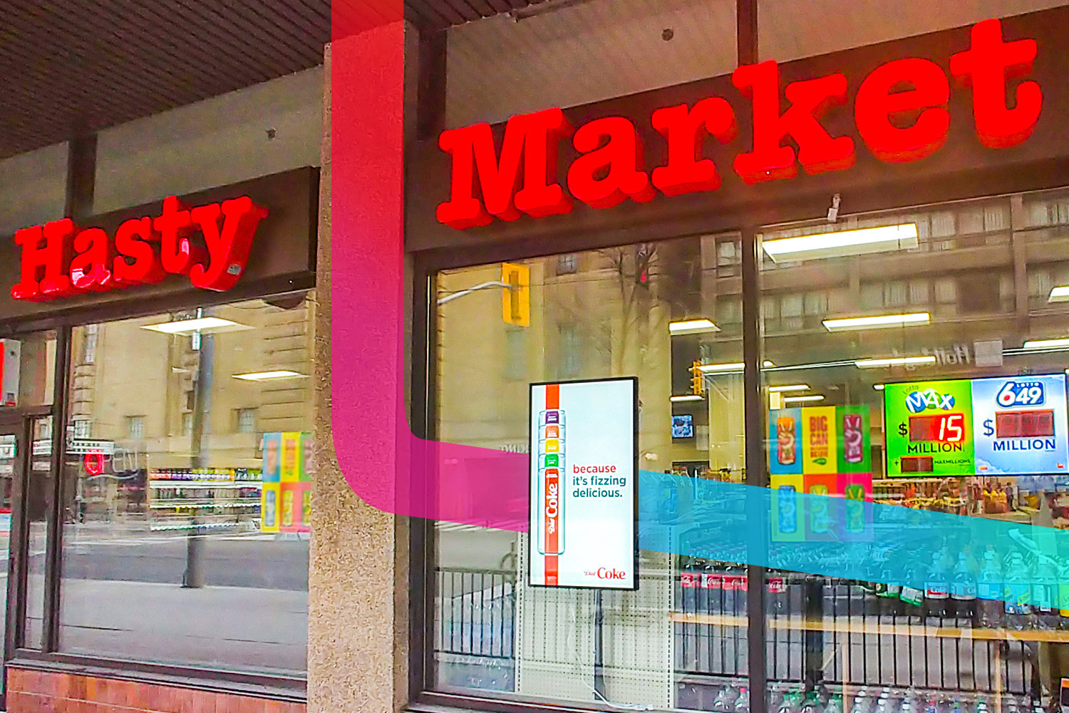 Adapt Media has capitalized on the strength and loyalty of Hasty Markets’ customers by installing screens in both the front windows (AMP screens) and at the cash registers (POP screens) of many of the Hasty Market locations across the Greater Toronto and Hamilton Area.